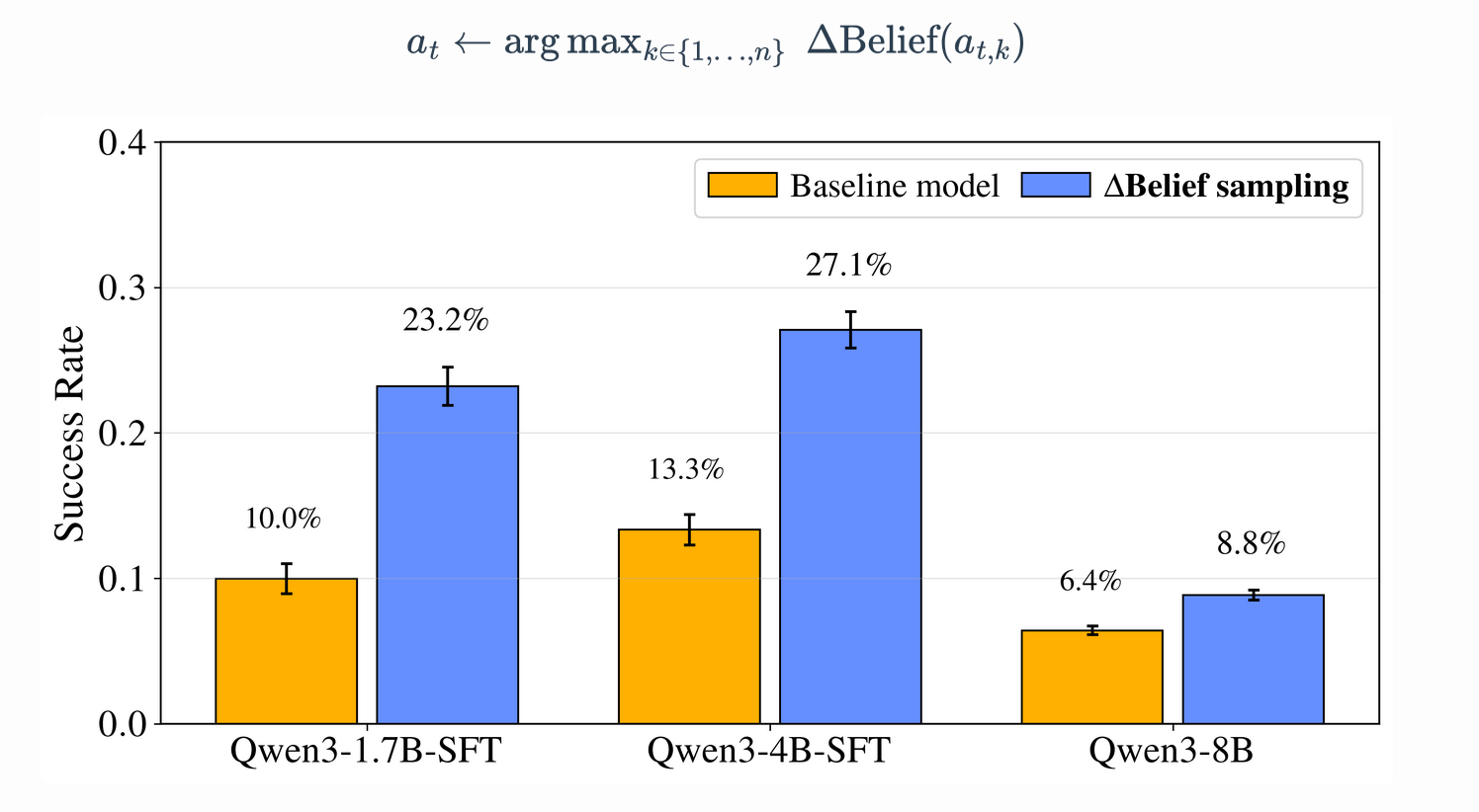 Model Scale | SFT Baseline Success Rate | Delta Belief-Guided Sampling (Best-of-8) |