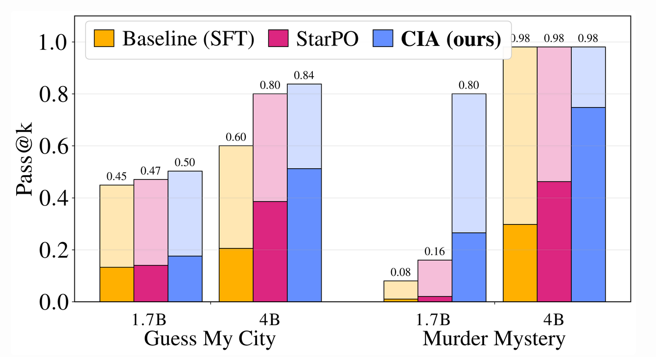 - Murder Mystery: CIA achieved its most significant gains here, leading StarPO by up to 28.5% in Pass@1. Qualitative analysis of rollouts shows the agent performing granular deduction—identifying specific clues like a "missing ledger" or a "coiled fish" watermark—rather than making undirected guesses.