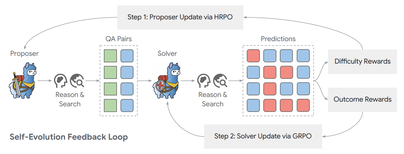 - The Proposer (\pi_\theta): This agent's primary function is to generate diverse and challenging question-answer (QA) pairs. It leverages an external search engine to gather information and construct multi-hop questions that require complex reasoning to solve. Its goal is to create tasks that are difficult but still verifiable.