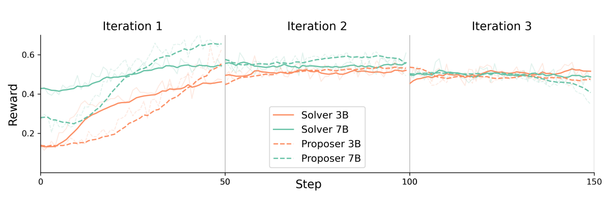 - Iterative Improvement: The framework sustains improvement into a second iteration, with the 3B model showing an average performance gain of 4.93%. However, performance tends to plateau after 2-3 iterations, indicating technical constraints that limit indefinite self-evolution.