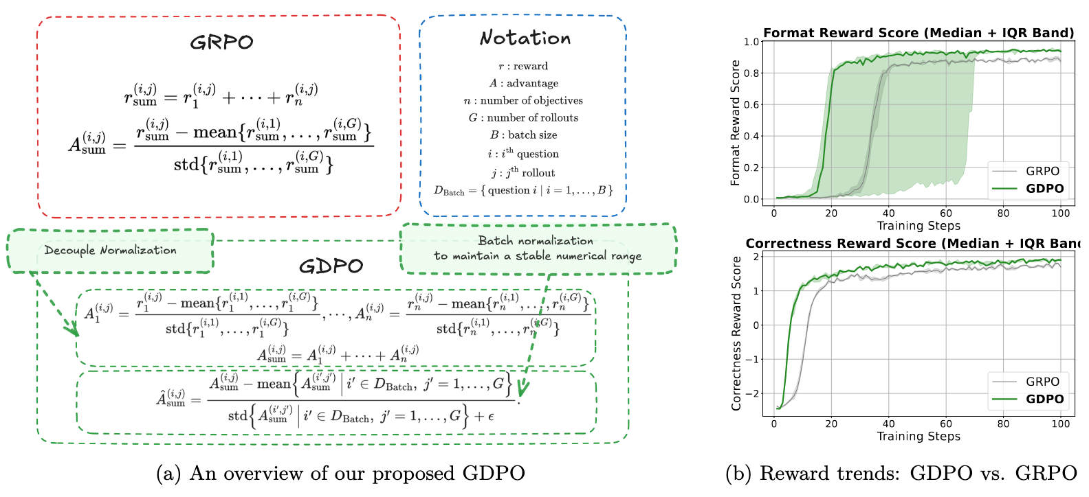 - Decoupled Group-wise Normalization: Each reward component k is normalized independently across the group: A^{(i,j)}_k = \frac{r^{(i,j)}_k - \text{mean}\{r^{(i,1)}_k, \ldots, r^{(i,G)}_k\}}{\text{std}\{r^{(i,1)}_k, \ldots, r^{(i,G)}_k\}}