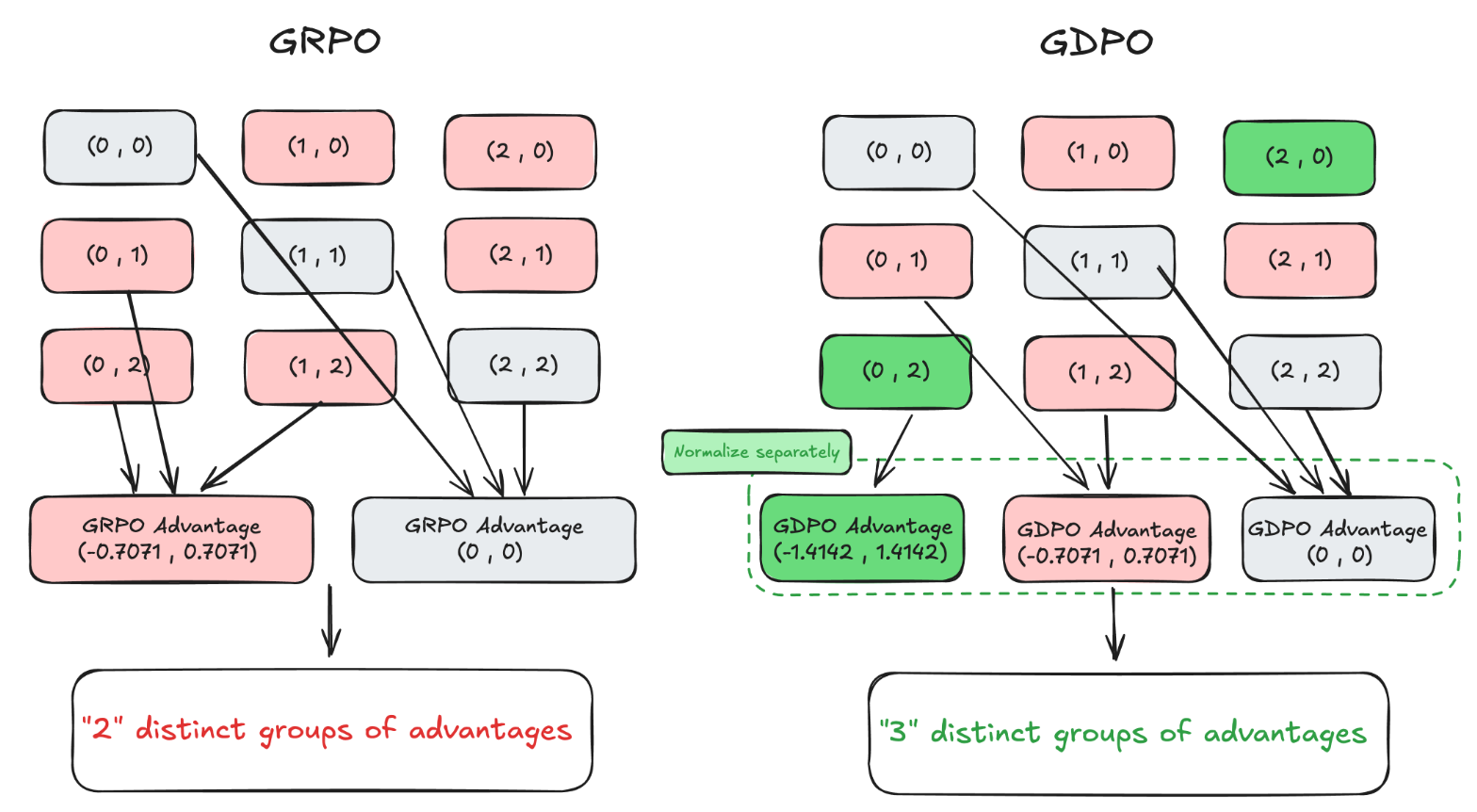 In this setup, GRPO is functionally "blind" to the difference between a rollout that satisfies two rewards versus one that satisfies only one, provided the relative difference within the group is identical. GDPO, by decoupling normalization, preserves three distinct groups in this same scenario.