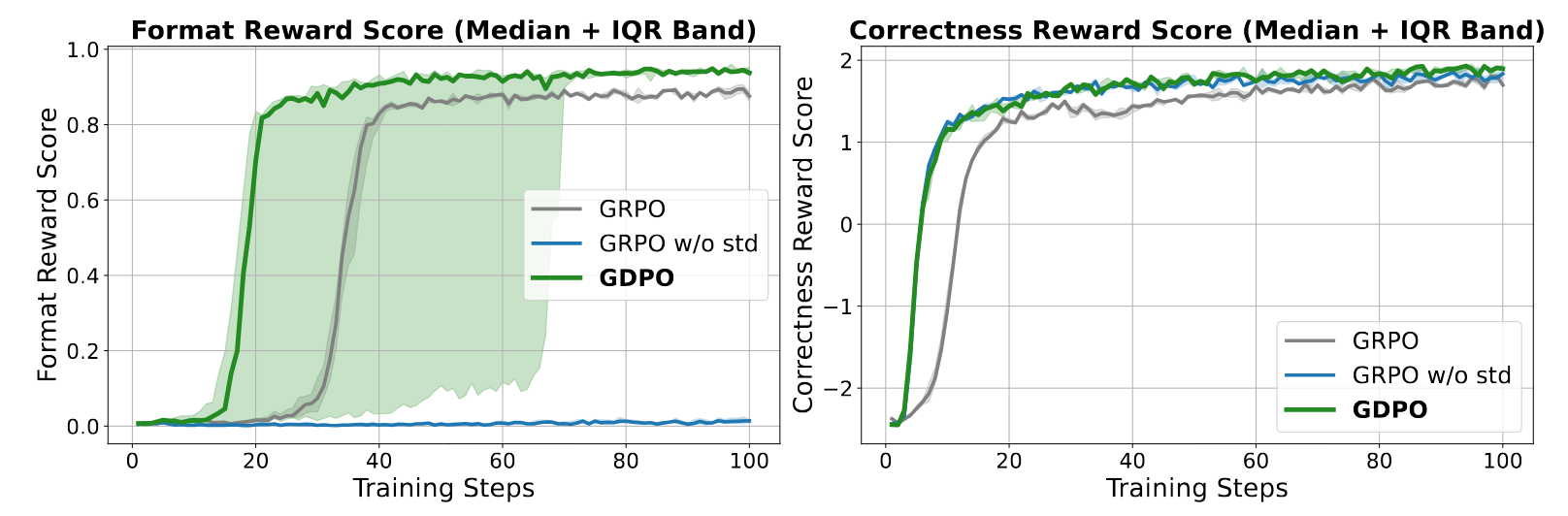 Notably, GRPO w/o std failed entirely on the format reward (0% correctness), emphasizing the stability of the GDPO architecture.