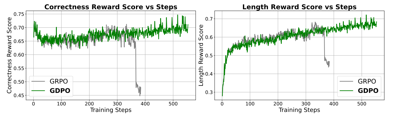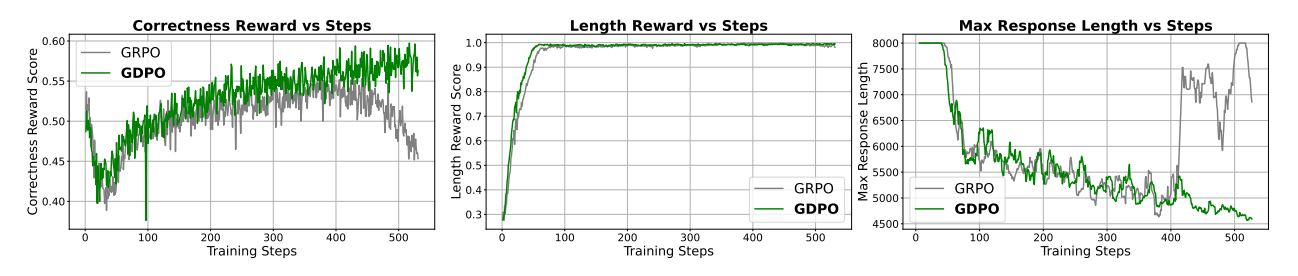 In summary, GDPO remediates reward signal collapse by decoupling normalization and preserving advantage granularity. By providing a richer training signal, it enables stable convergence and superior alignment across complex, multi-objective tasks. As LLMs are increasingly tasked with balancing accuracy, safety, and efficiency, GDPO serves as the superior foundation for aligning models with the nuanced preferences of human users in real-world deployment.