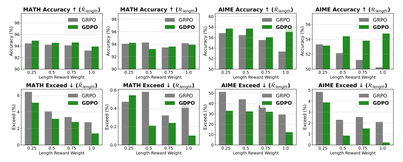 On benchmarks (AIME, MATH, AMC), GDPO demonstrated a unique "recovery" phenomenon. In early training, both GDPO and GRPO prioritize the easier length reward, causing an initial drop in correctness. However, GDPO effectively recovers the correctness signal, while GRPO’s correctness eventually declines as it fails to balance the competing objectives.