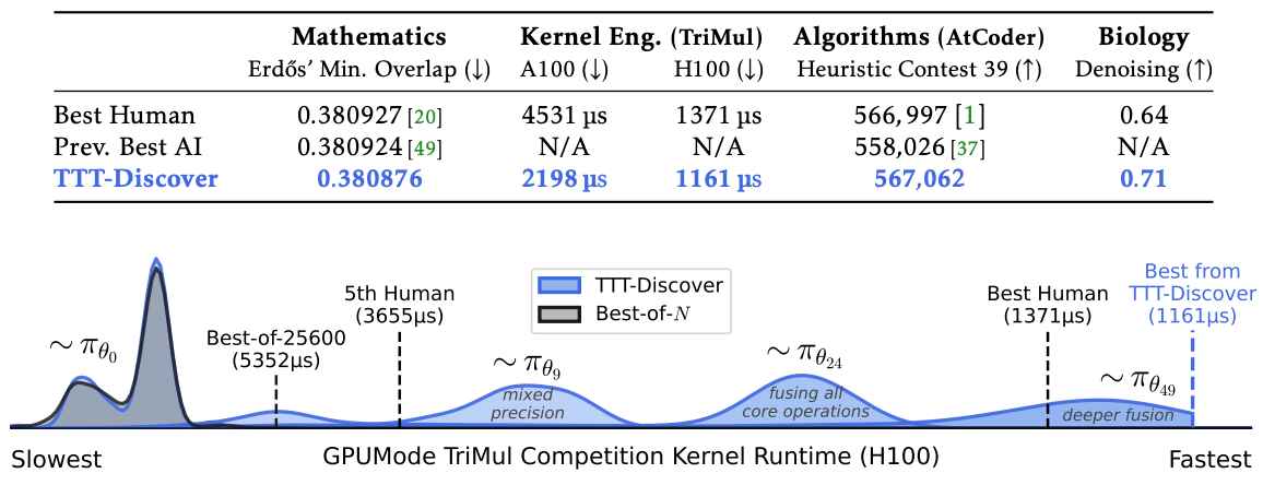 The empirical evidence presented is both broad and compelling. TTT-Discover has set new state-of-the-art benchmarks across four diverse and challenging domains—mathematics, GPU kernel engineering, algorithm design, and single-cell analysis. These results, achieved with a reproducible, open model, demonstrate a powerful and generalizable approach to tackling complex scientific and engineering problems. The discovered solutions, validated by human experts, are not just incremental improvements but often represent new and more complex strategies.
