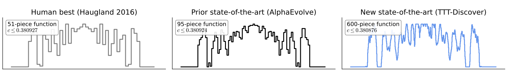 - Erdős’ Minimum Overlap Problem: TTT-Discover improved the upper bound to 0.380876, surpassing the previous AI state-of-the-art (0.380924) set by AlphaEvolve. This improvement is 16 times larger than AlphaEvolve’s improvement over the previous human state-of-the-art. The discovered solution is a highly complex, 600-piece asymmetric step function, a departure from the simpler, symmetric constructions found by prior work (Figure 2, source).