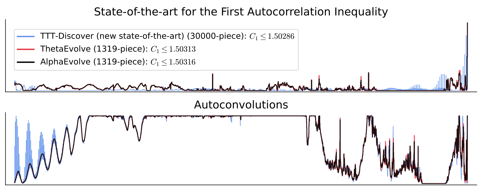 - First Autocorrelation Inequality: The method improved the upper bound to prove C1 ≤ 1.50286. In contrast to prior work which refined existing constructions, TTT-Discover found this superior bound by developing a new 30,000-piece step function from scratch (Figure 3, source).