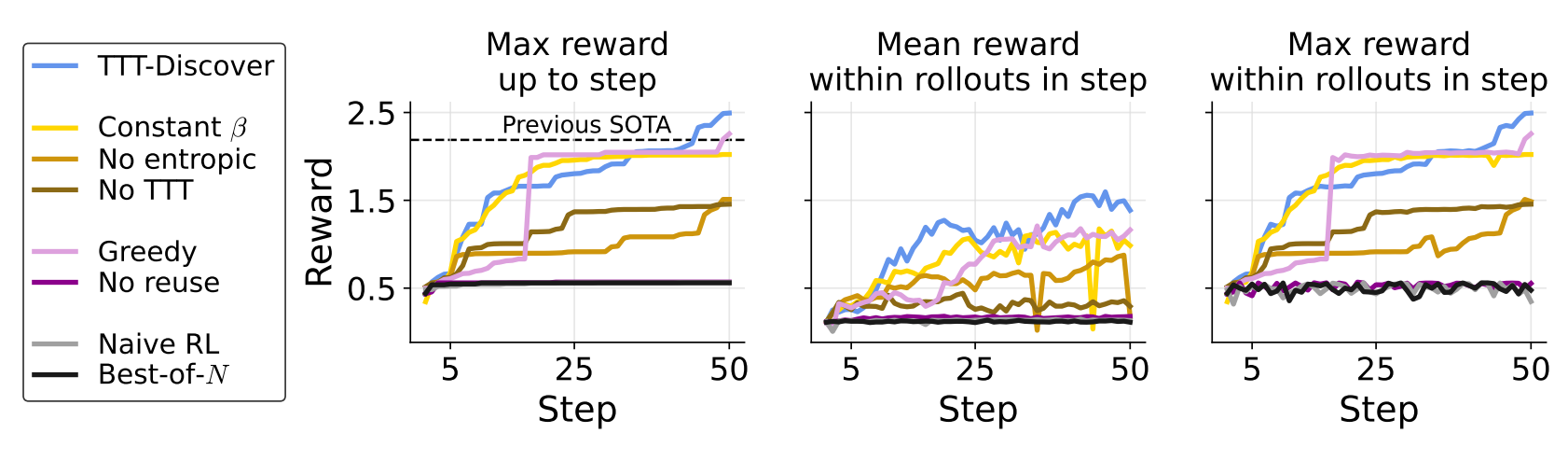 These strong results across four different fields demonstrate the power and versatility of the TTT-Discover methodology. We now turn to validating the specific design choices that enabled this performance.