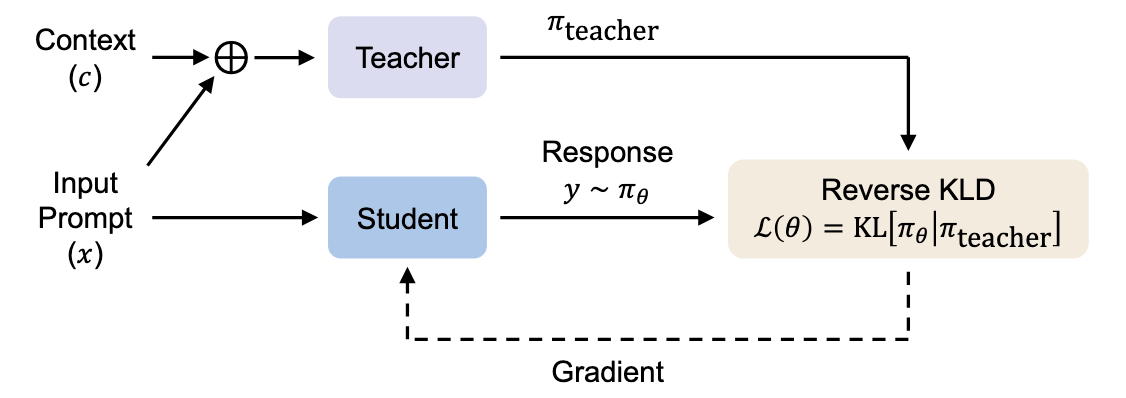 L(\theta) = \mathbb{E}_{(x,c)\sim D, y\sim \pi_\theta(\cdot|x)} \left[ \frac{1}{|y|} \sum_{t=1}^{|y|} D_{KL} (\pi_\theta(\cdot | x, y_{<t}) \parallel \pi_{teacher}(\cdot | c, x, y_{<t})) \right]