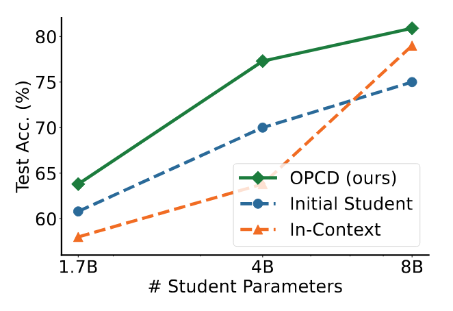 OPCD enables "Cross-Size Distillation," where small models internalize the expertise of larger counterparts. However, researchers discovered the In-Context Degradation Paradox: for smaller models (1.7B/4B), directly prepending teacher-generated experiential knowledge into the context window actually lowers performance compared to the base model. This confirms that on-policy alignment is essential; smaller models cannot reliably consume complex teacher insights in-context and must instead have that knowledge distilled into their weights via OPCD.