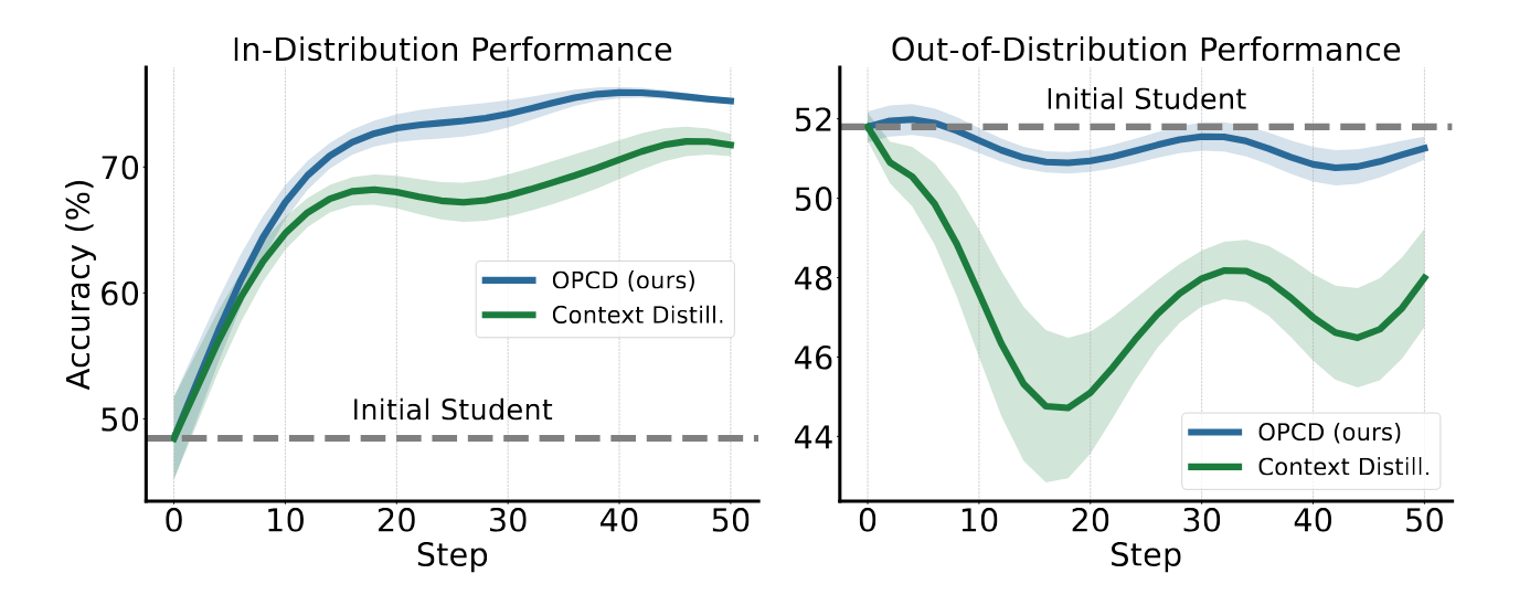 Furthermore, OPCD effectively Mitigates Catastrophic Forgetting. In out-of-distribution (OOD) tasksâsuch as medical QA after safety distillationâOPCD preserved general capabilities better than off-policy methods by approximately 4 percentage points.