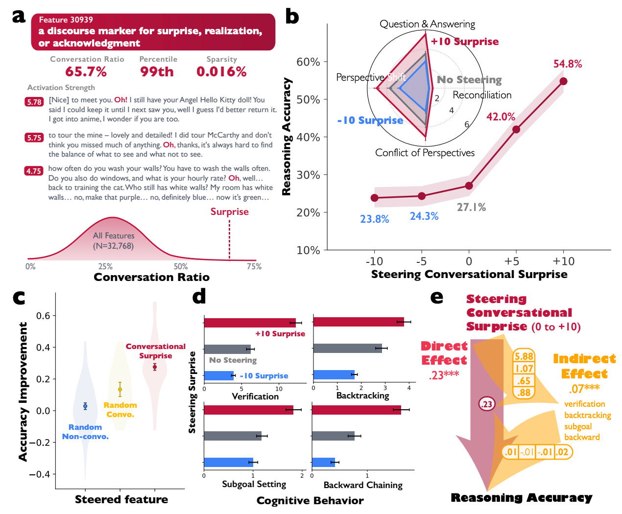 - Targeted Performance Enhancement Our mechanistic interpretability findings provide a direct path to enhancing existing models. The ability to identify and steer specific neural features related to conversational dynamics offers a precise method for improving reasoning performance without the need for costly and extensive retraining. This opens the door to fine-grained control over a model's cognitive processes, allowing for targeted improvements in areas like verification, error correction, and creative problem-solving.