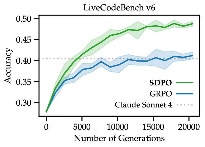 On LiveCodeBench v6, SDPO achieves GRPO’s final accuracy in 4x fewer generations. In Chemistry tasks, it delivers a 10x wall-clock speedup. Notably, SDPO's gains grow with model scale; on Qwen3-8B, it reaches 48.8% accuracy, outperforming the strongest instruct models on the public leaderboard, including Claude Sonnet 4 (40.5%).