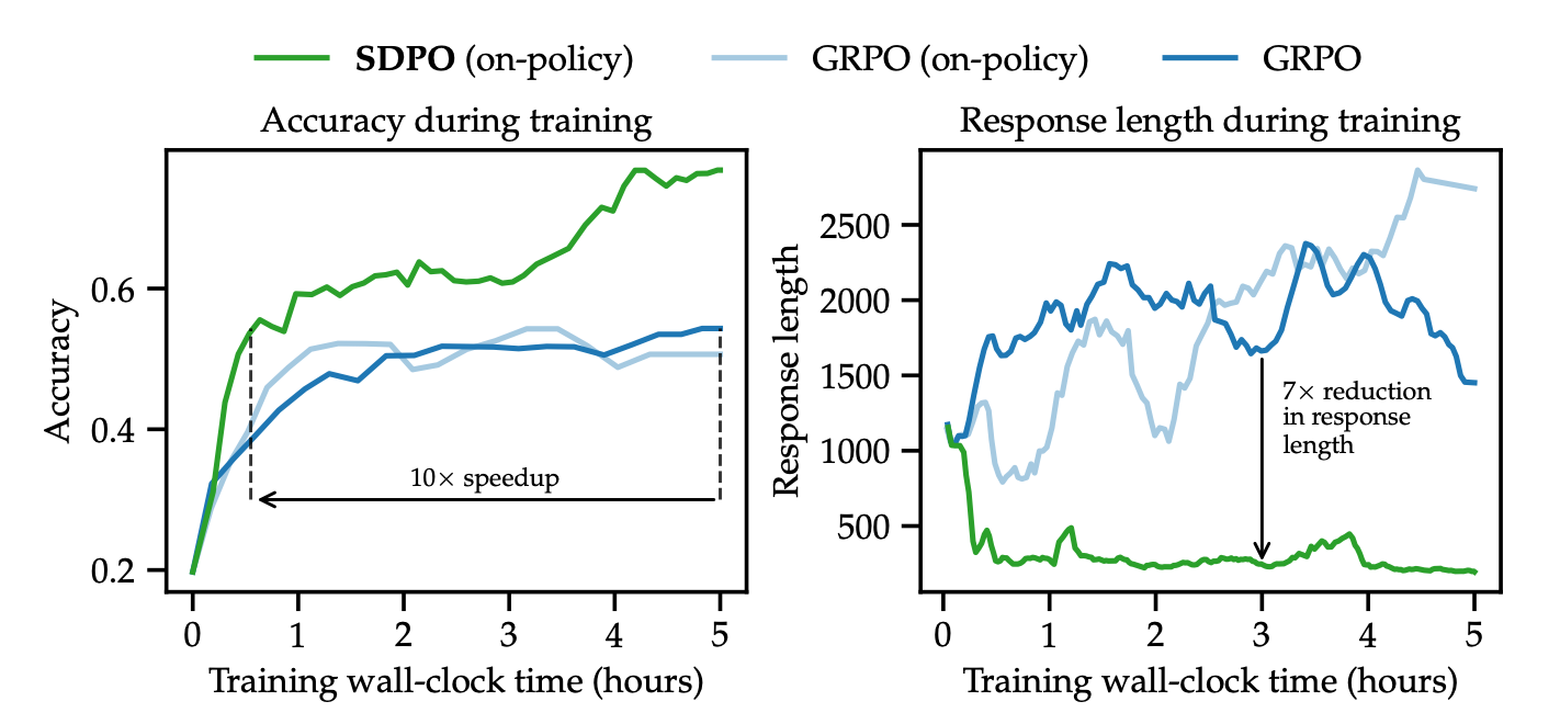 SDPO serves as a high-performance, drop-in replacement for standard RLVR pipelines. By leveraging the model's own retrospection to convert environment feedback into dense self-supervision, SDPO removes the information bottleneck of scalar rewards. The result is a paradigm that is not only faster and more sample-efficient but also produces reasoning that is concise, robust, and fundamentally more accurate.