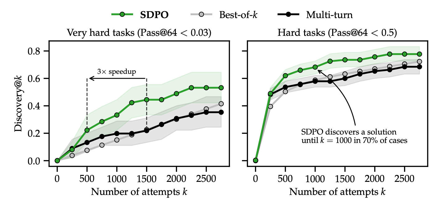 - SDPO discovered the solution after 321 attempts, despite the Self-Teacher's initial accuracy on the task being 0%.