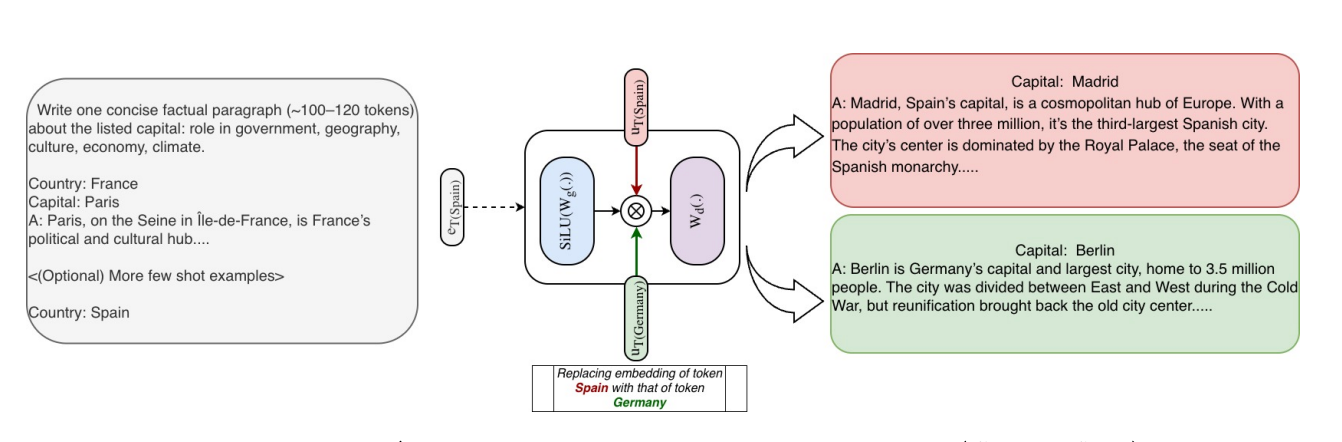 The direct, token-indexed nature of STEM embeddings allows for causal knowledge editing with surgical precision. Because each embedding is tied to a specific token ID, we can directly manipulate the model's factual knowledge by simply swapping embeddings, without altering the input text.