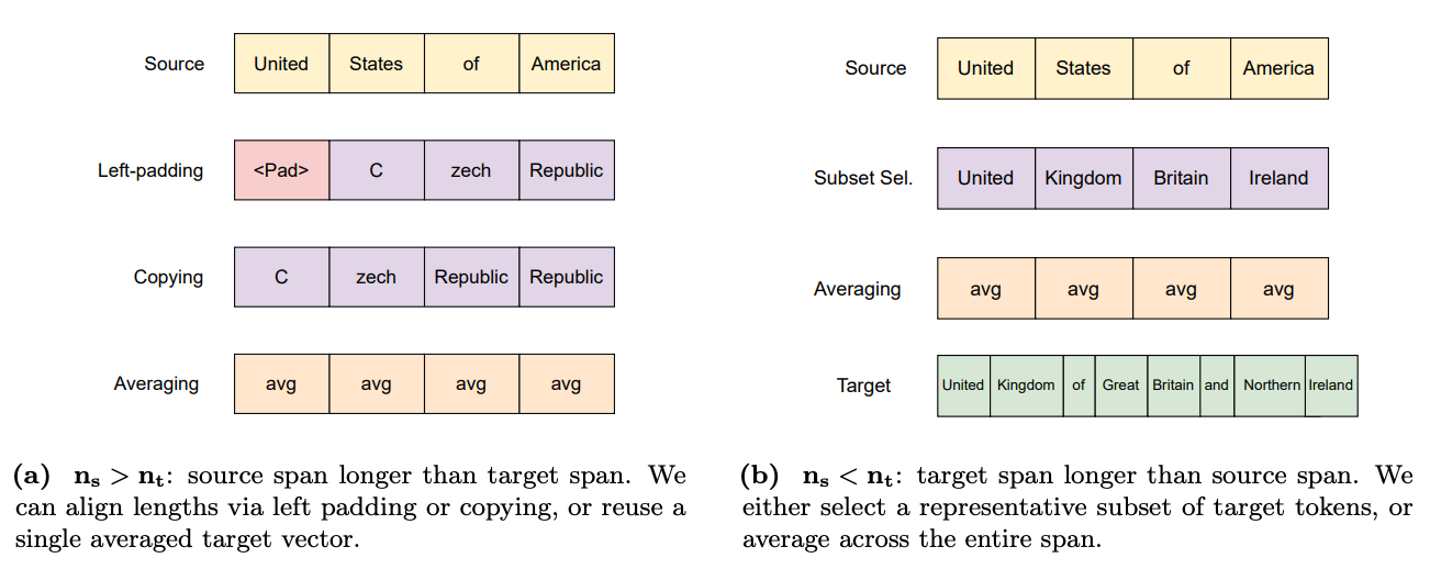 - Copying: An alternative for n_s > n_t; tokens from the shorter target sequence are repeated to fill the longer source span.