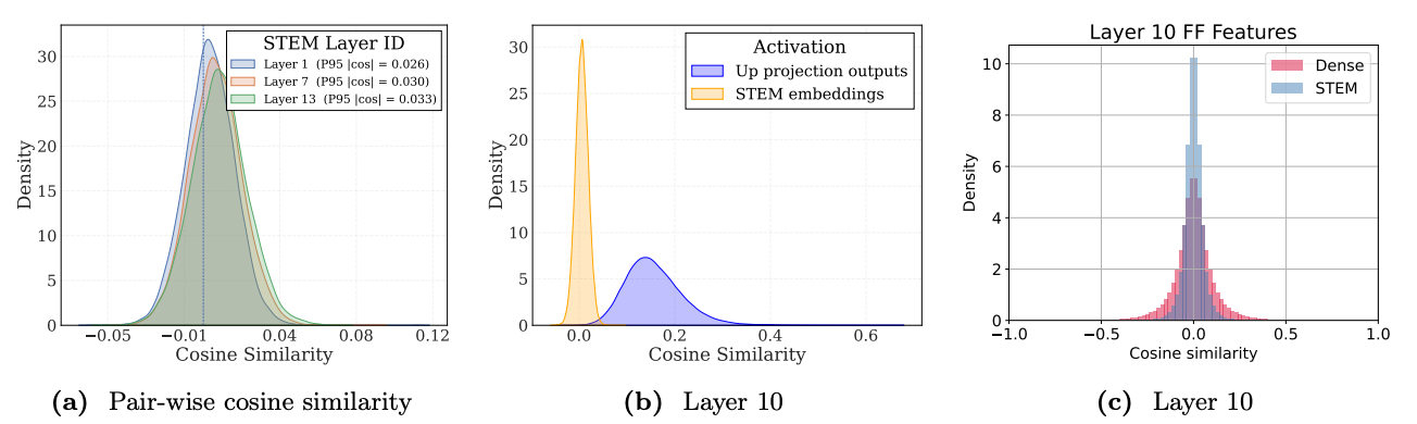 Analysis of the learned STEM embeddings reveals a key geometric property: they exhibit a large angular spread, meaning they have very low pairwise cosine similarity. The distribution plots in Figure 6 show that most embedding vectors are nearly orthogonal to one another.