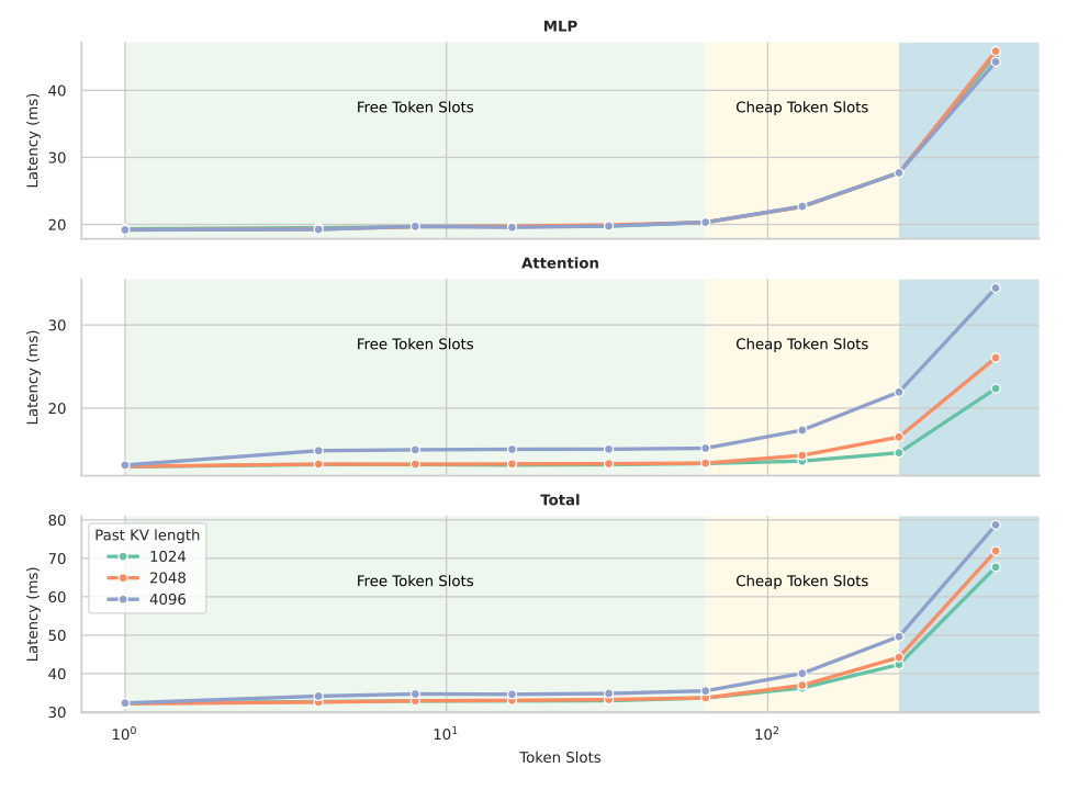 Analysis of GPU performance profiles reveals the existence of "free token slots"—a significant amount of untapped computational capacity (see Figure 1). These slots represent the ability to process a batch of additional tokens in a single forward pass with a minimal, often negligible, increase in overall latency. By failing to utilize these slots, traditional AR models leave substantial performance gains on the table.
