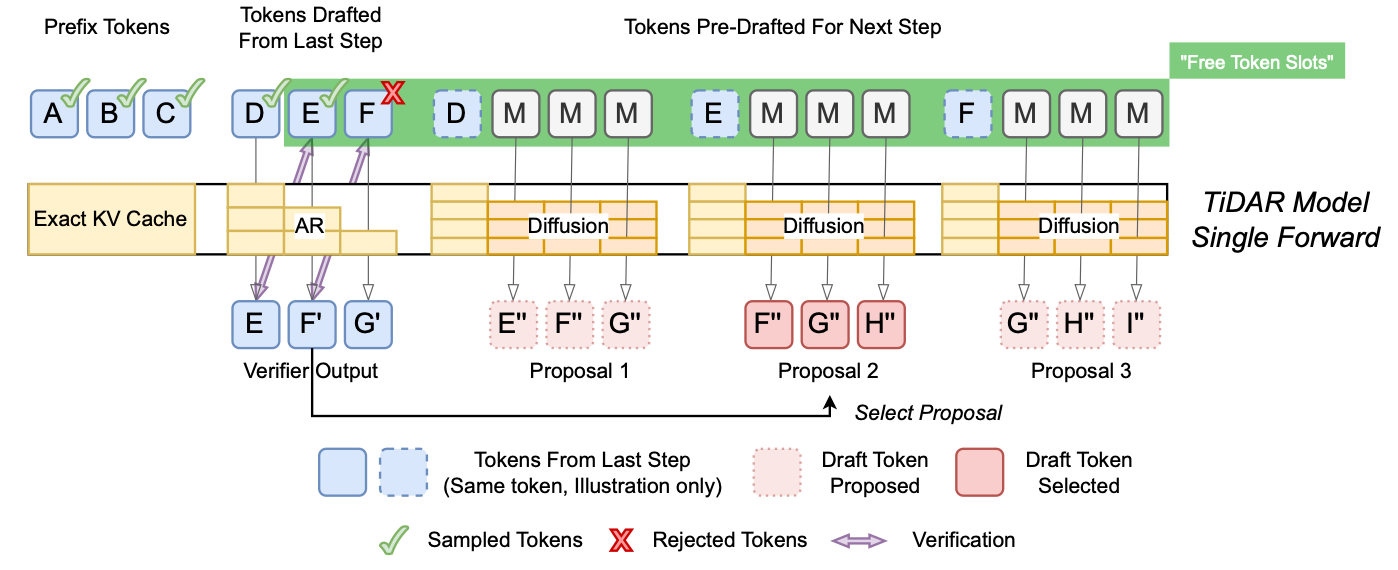 As depicted in the inference process, each generation step simultaneously performs two critical functions. First, it verifies previously drafted tokens using autoregressive rejection sampling to ensure high quality. Second, it generates new draft proposals for the next step in parallel. This concurrent operation allows TiDAR to fully utilize the GPU's "free token slots," converting idle compute capacity into a direct performance gain.