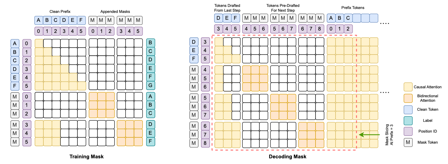 - Pre-drafted tokens for the next step: These are special mask tokens where new candidates are generated. They are processed with bidirectional attention, allowing the model to operate in a parallel, diffusion-like mode.