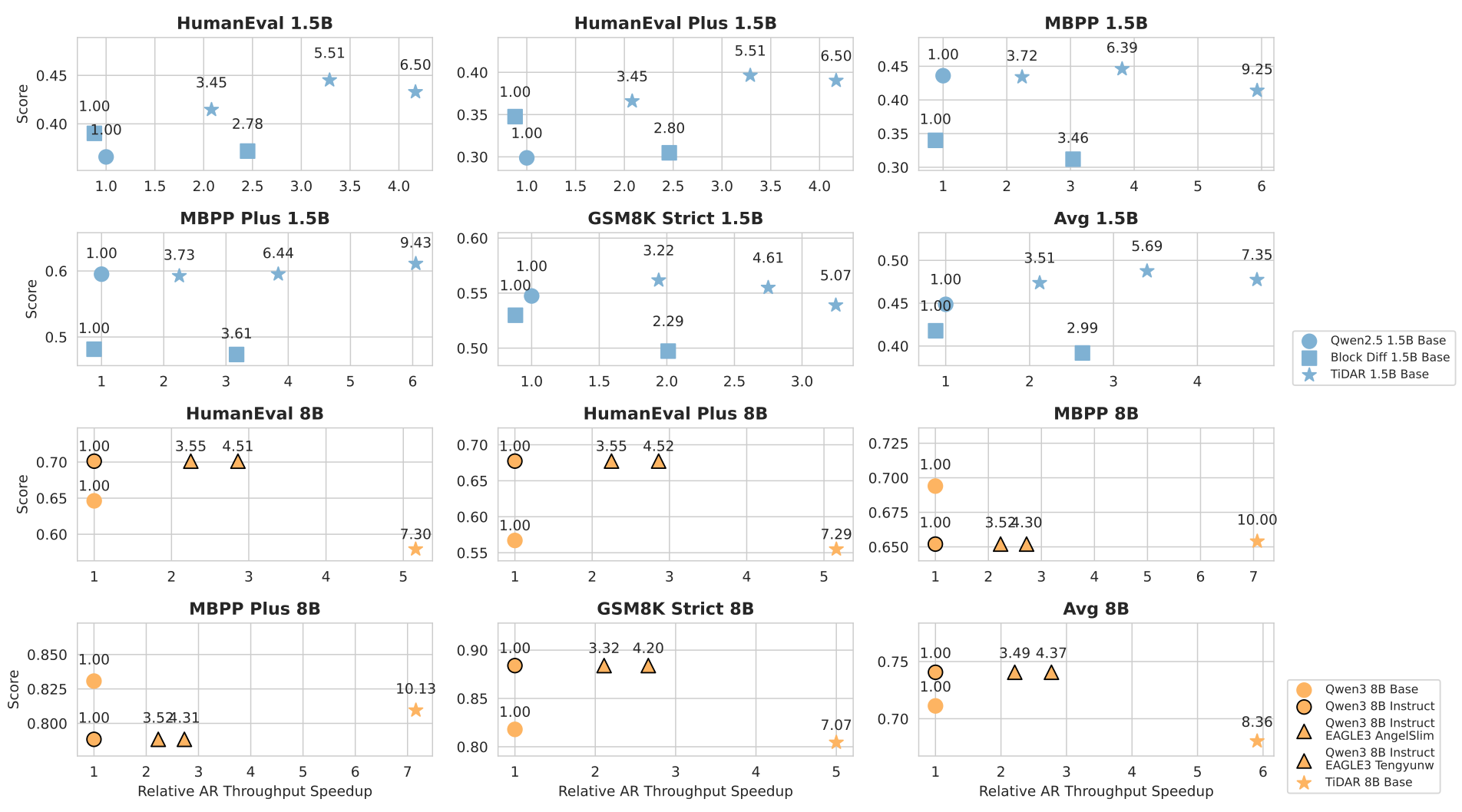 When benchmarked against a range of alternative methods, TiDAR consistently establishes a superior efficiency-quality trade-off. Evaluations show that TiDAR outperforms leading diffusion models like Dream and Llada, internal Block Diffusion baselines, and state-of-the-art speculative decoding methods such as EAGLE-3. On Pareto frontier analyses, which plot quality against efficiency, TiDAR consistently occupies a more favorable position.